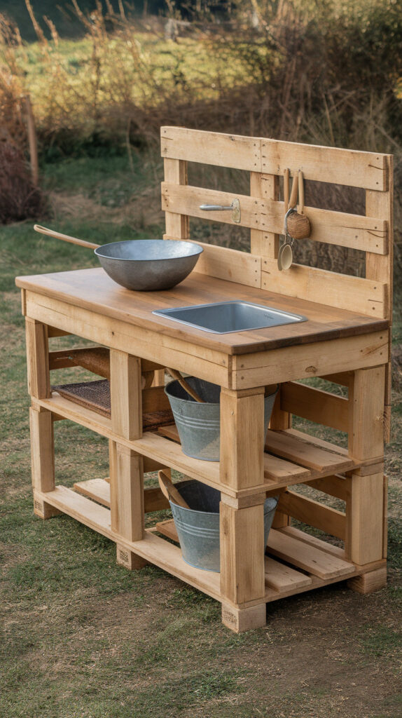 I’ve built one of these with nothing but two pallets, leftover screws, and a salvaged countertop piece. It wasn’t fancy, but it held up through rain, spilled water buckets, and more “mud cupcakes” than I can count.
