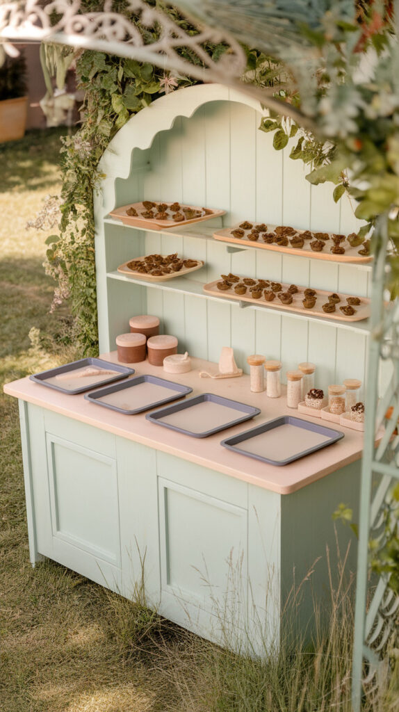 Not every mud kitchen needs to scream “soup factory.” A bakery-style setup adds personality and focused pretend play. Think cupcakes, pies, and leaf cookies.