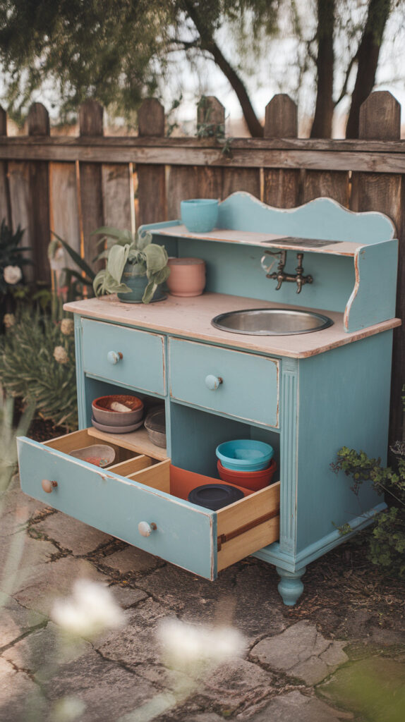 Old dressers usually end up on the curb, even though they’re basically pre-built storage units. Instead of tossing one, turn it into a mud kitchen that feels surprisingly polished. The drawers become built-in storage for bowls, spoons, and random nature finds.
