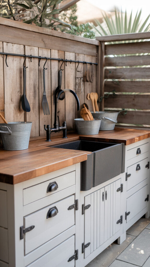 Sometimes outdoor play setups look too toy-like. A farmhouse-inspired mud kitchen blends into your patio décor instead of standing out awkwardly. Think wood tones, simple lines, and subtle details.