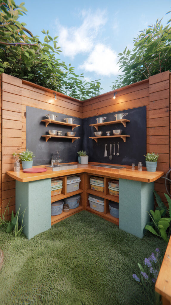 Paint the walls behind it with outdoor chalkboard paint so kids can write menus. Keep shelves minimal so the space doesn’t feel crowded.