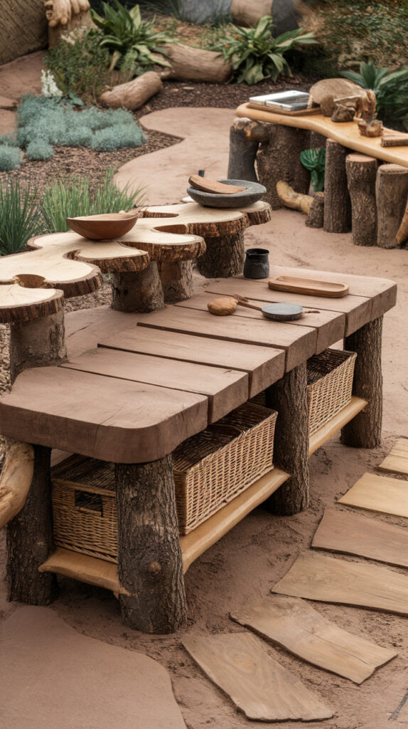 Plastic accessories feel out of place in a garden setting. A nature-focused mud kitchen leans into stones, wood slices, and woven baskets. It blends seamlessly with plants and trees.