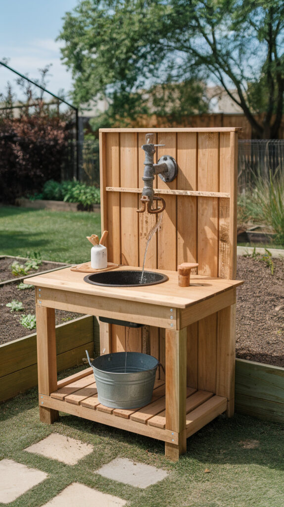 Buckets get the job done, but a simple hand pump adds excitement. It gives kids a more realistic cooking experience. Plus, it controls water flow better than constant hose use.
