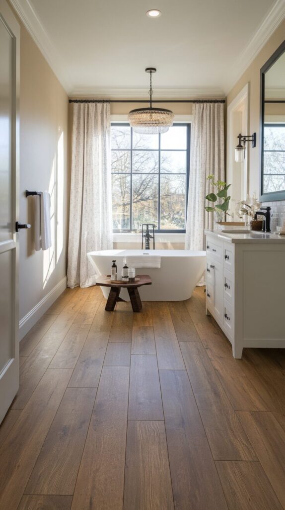 Luxury vinyl plank, or LVP, feels like the cheat code of bathroom renovations. I used it in my own guest bath after watching a friend’s hardwood warp into sadness, and I never looked back. LVP handles water like a champ and still gives that cozy, spa-like wood vibe.