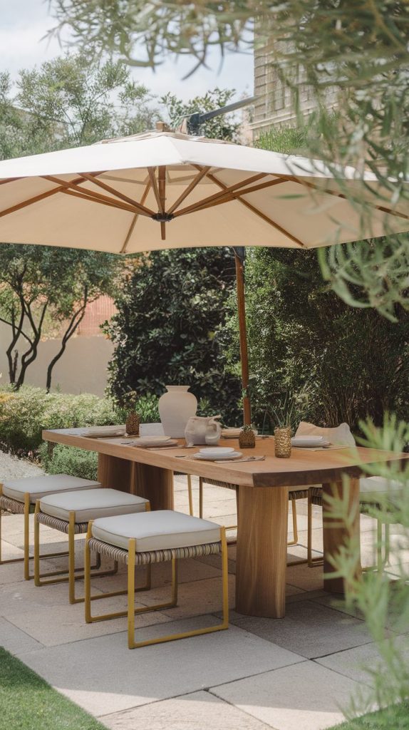 Shade matters more than people expect. A patio umbrella, pergola, or even a sail shade keeps meals enjoyable during sunny afternoons. Nobody wants to squint or sweat through dinner, no matter how cute the table looks.