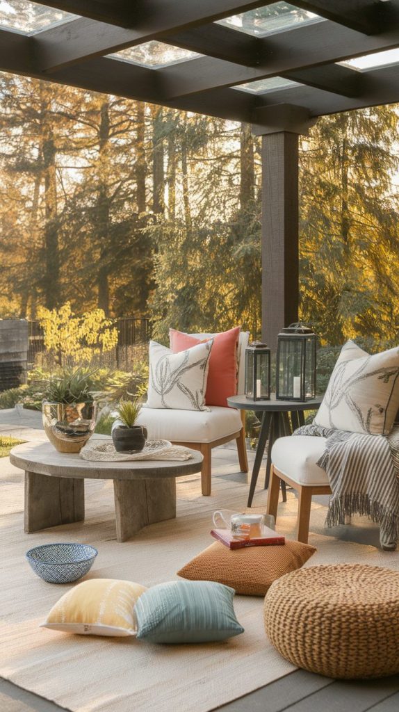 Throw pillows and blankets add comfort and color. Choose outdoor-friendly fabrics so you don’t stress about weather. I keep a small storage bench nearby for easy access.