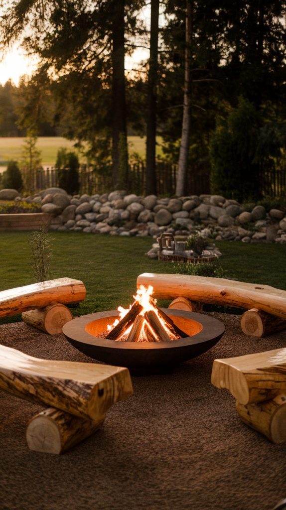 9. Fire Pit with Natural Wood Seating for a Cabin Feel