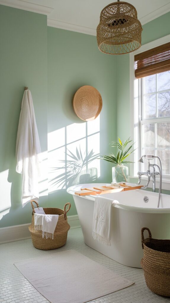 To complete the look, pair your pastel walls with white fixtures, woven baskets, and a few leafy plants. The combination feels fresh, clean, and effortlessly calming—like your own private retreat.