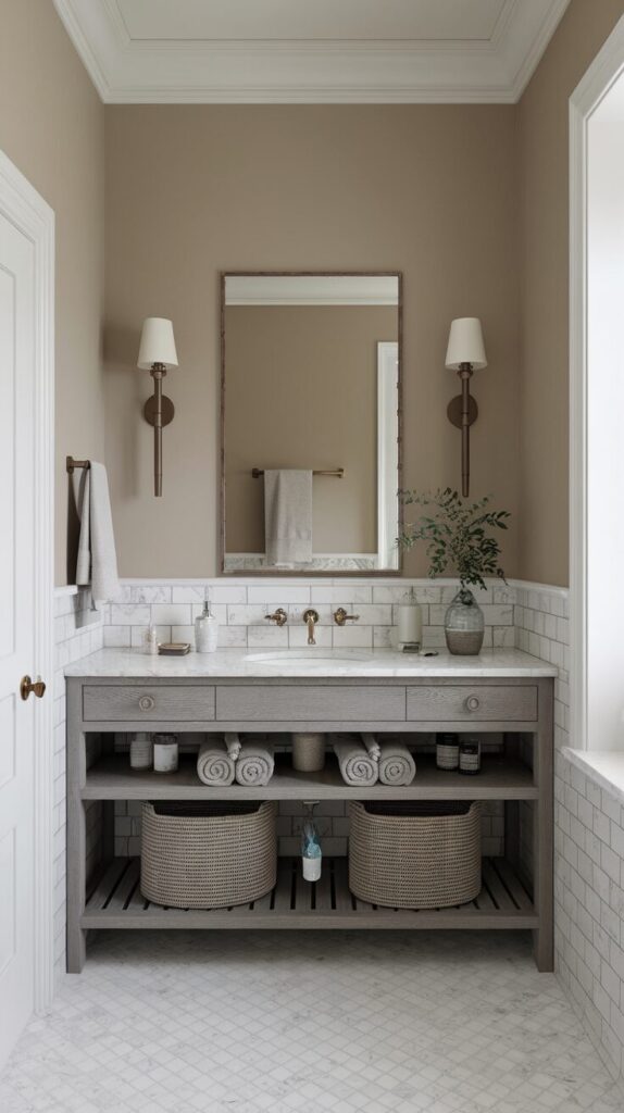 The best part? You’ll never feel stuck with a single look. Neutrals let you play with bold towels, patterned rugs, or colorful wall art—without clashing. It’s a safe yet stylish choice that feels endlessly adaptable.