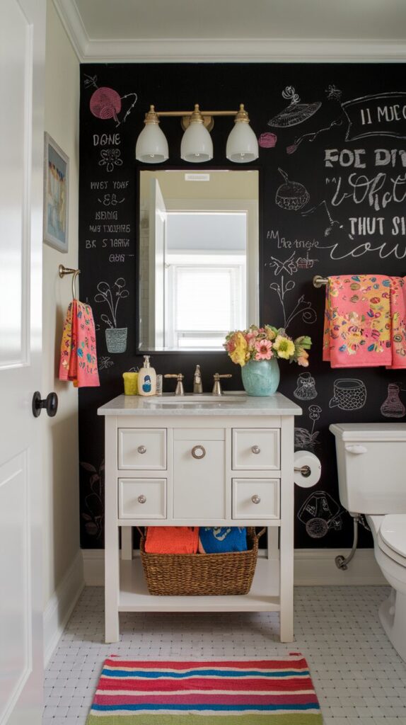 Why not make your walls interactive? Chalkboard paint adds playful energy, making your bathroom more than just a functional space. Kids will love doodling, while adults can jot down notes, affirmations, or even a to-do list.