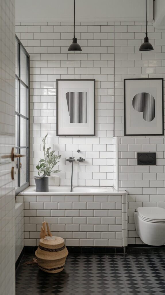 One fun way to keep your bathroom looking sleek is by hanging black-and-white prints. They’re timeless, versatile, and blend beautifully with nearly any bathroom color scheme. From simple line drawings to bold geometric patterns, this look never feels outdated.