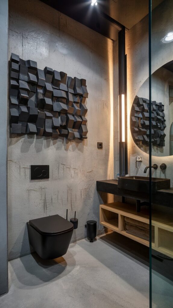 Kick your bathroom style up a notch with 3D artwork. Metal wall sculptures, wire art, or layered wood pieces add depth and texture in ways flat prints can’t. This is especially striking in modern or industrial bathrooms.