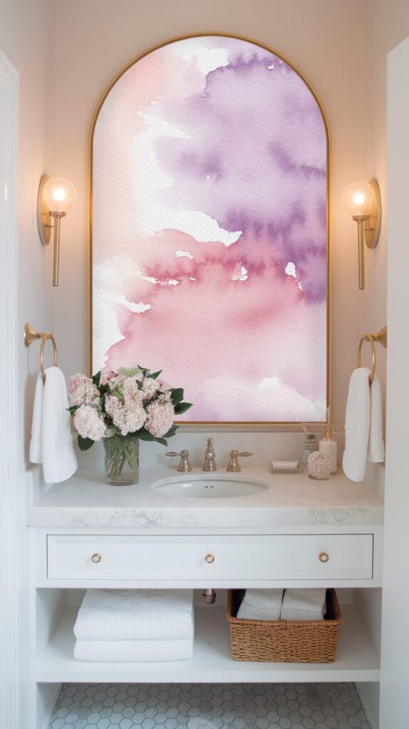 Looking for something dreamy and calming? Watercolor art in pastel shades is perfect. Think soft blues, blush pinks, or lavender washes. These delicate hues create a tranquil bathroom atmosphere that feels almost spa-like.