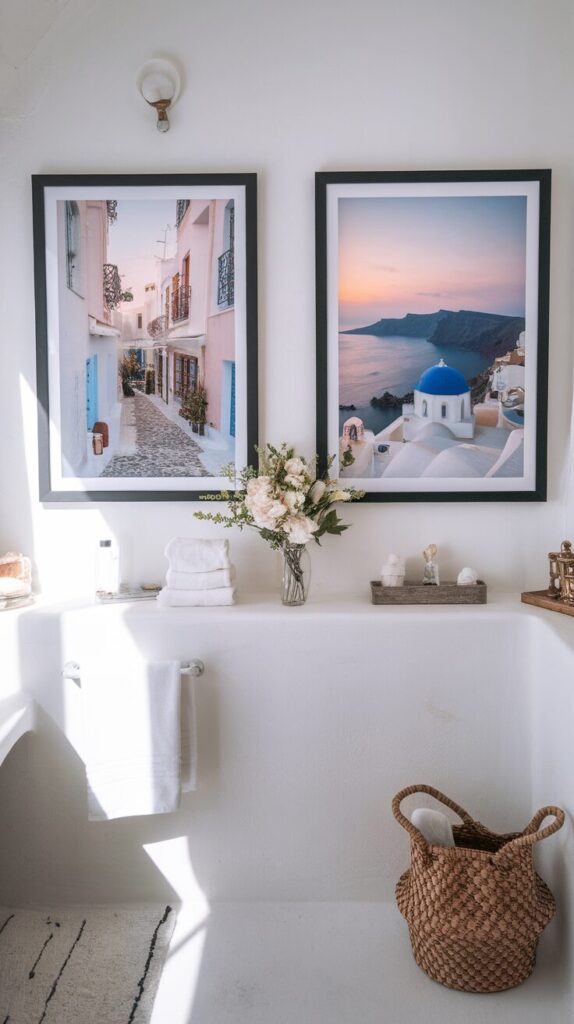 Show off your wanderlust by displaying your own travel photos—or prints of dream destinations. Imagine brushing your teeth while gazing at the Eiffel Tower, Santorini sunsets, or serene mountain views. It’s a daily reminder of adventures past or future.