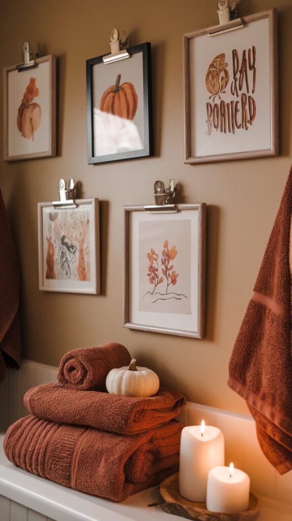 Want your bathroom to always feel fresh? Rotating your artwork by season is a simple solution. Think floral prints in spring, beachy themes in summer, warm-toned abstracts in fall, and cozy holiday art in winter.