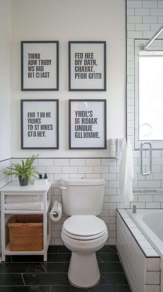 This one’s perfect if you love adding a touch of humor to your home. Quirky bathroom quote signs or witty typography prints never fail to get a laugh out of guests. Phrases like “Wash your worries away” or “You never know what you’ve got until it’s gone… toilet paper” add instant charm.
