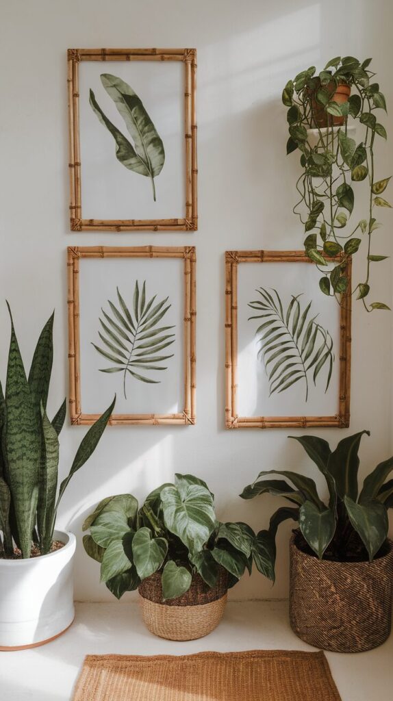 Choose frames in wood, bamboo, or rattan for a warm, organic look. Even a small cluster of botanical art can make a big difference in your bathroom’s mood.