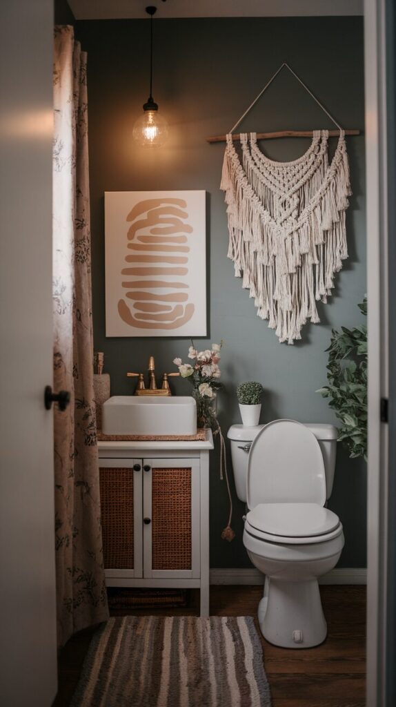 Here’s a budget-friendly yet deeply personal option: DIY art. Creating your own canvas paintings or handmade wall hangings gives your bathroom a one-of-a-kind look no store can replicate. It could be as simple as abstract brushstrokes or as detailed as a textured macrame piece.