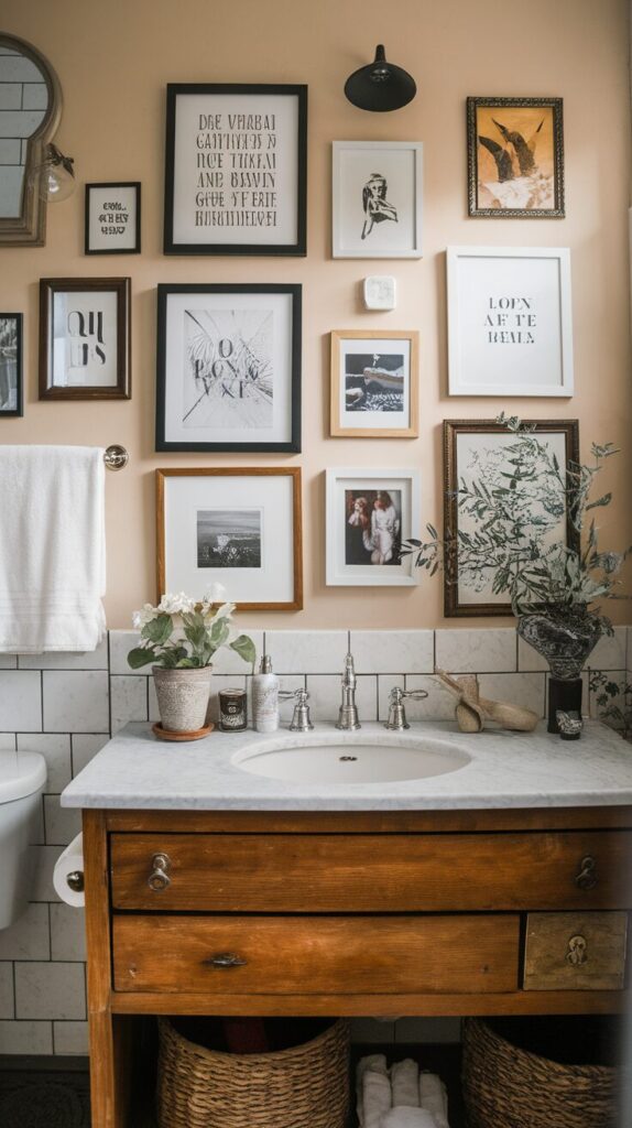 Gallery walls shine in bathrooms with blank expanses of wall, like above the toilet or a wide vanity. Start with a focal piece, then arrange smaller frames around it for balance.