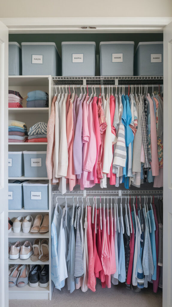 • Group clothing by type and season for easier access.