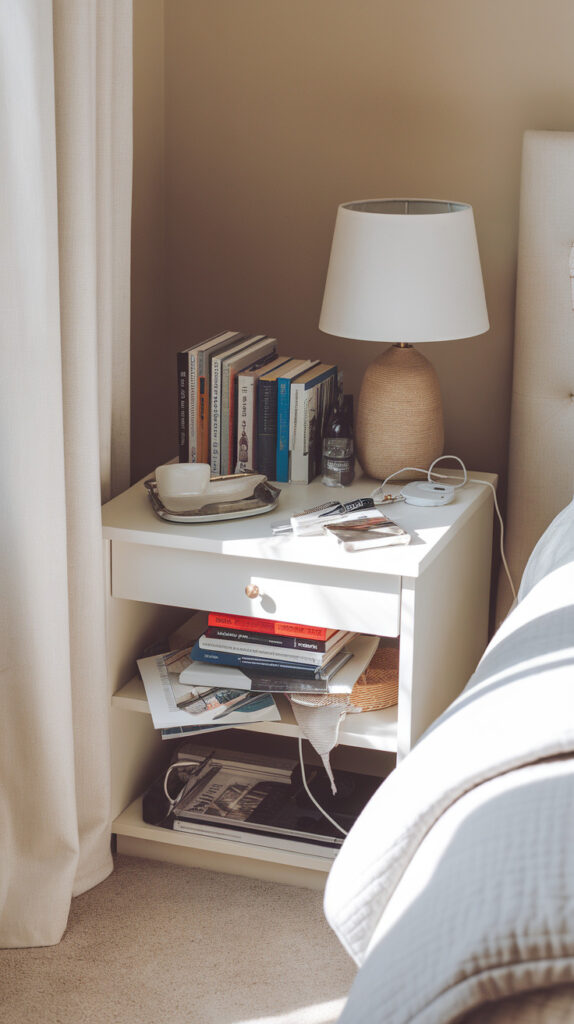 Nightstands collect clutter faster than almost any bedroom surface. Receipts, chargers, bottles, random hair ties, and half-read books pile up and make the room feel messy even when the bed looks neat.