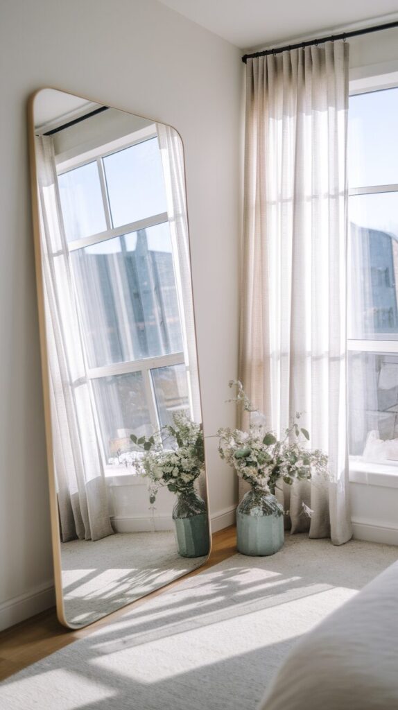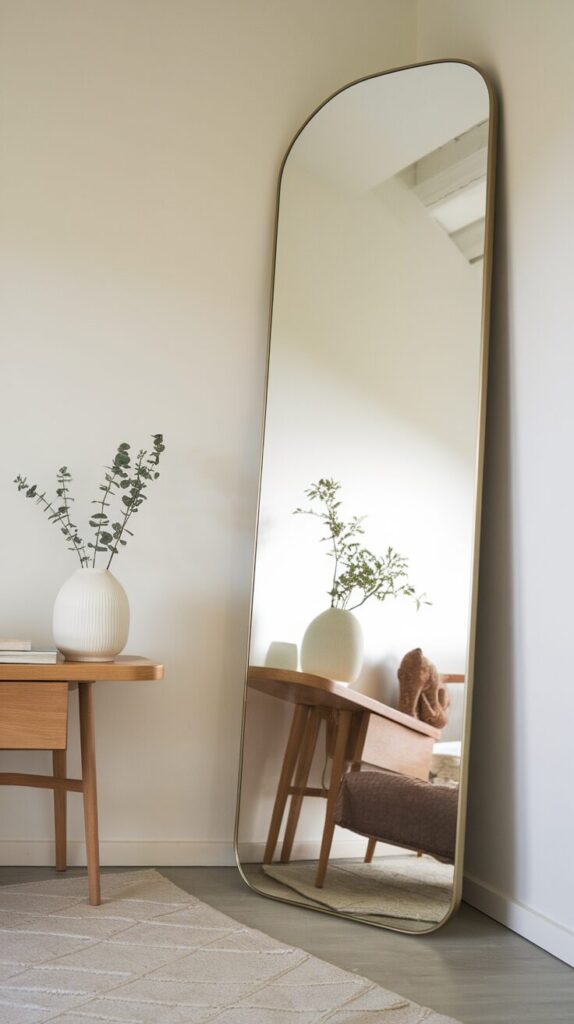 A tall mirror reflects both natural and artificial light across the room. The lean creates vertical lines that visually stretch the ceiling. Your eye reads the space as larger without you changing anything structural.