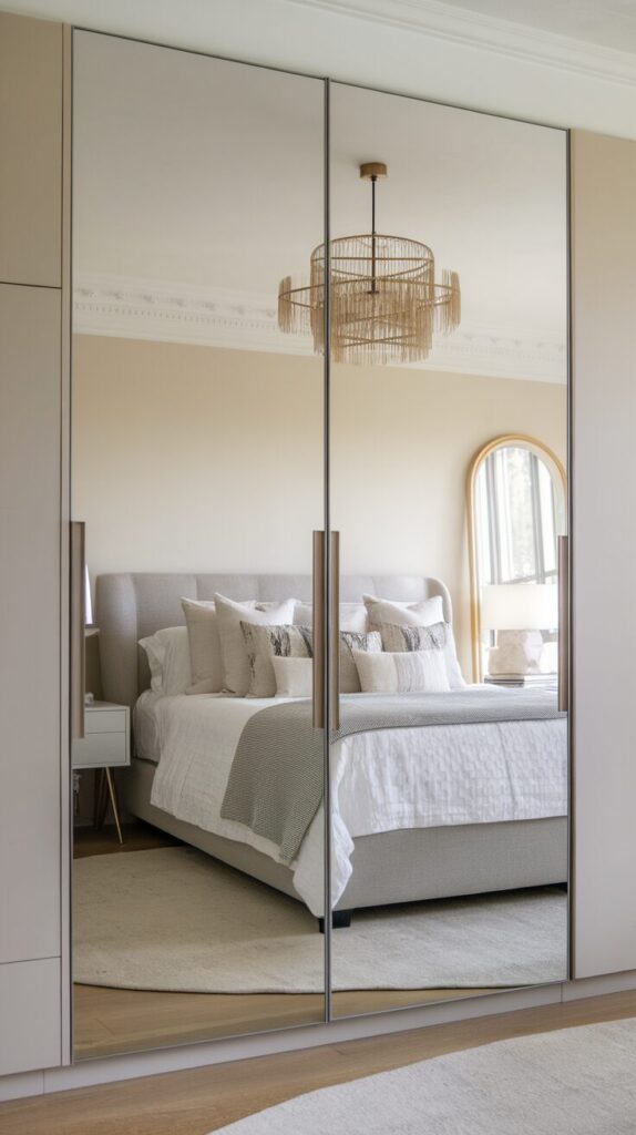 This idea suits bedrooms with sliding or standard closet doors. Mirrors turn wasted surfaces into functional features. You get light and utility in one move.