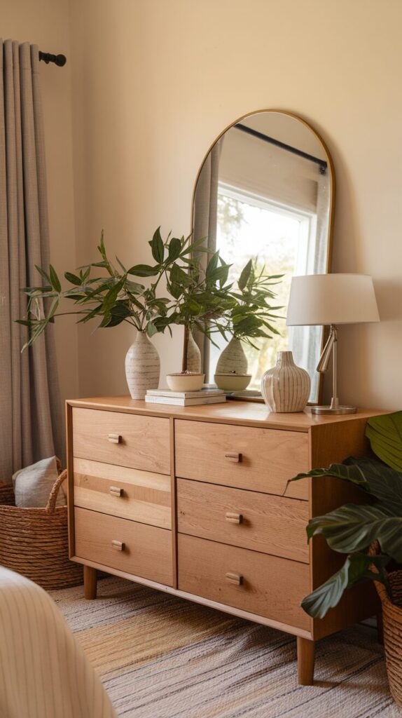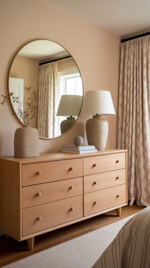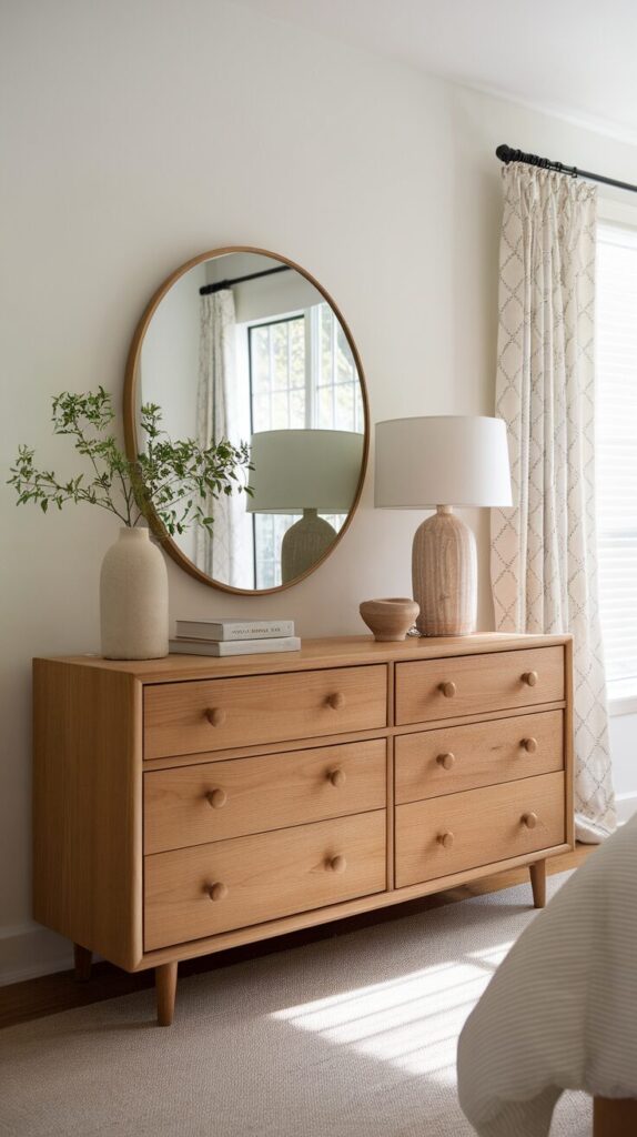 Match mirror width to dresser width. Avoid mirrors that feel undersized. Proportion matters.