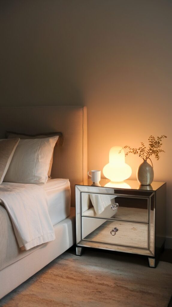 This idea works best when your bedroom feels heavy or dark. Mirrored nightstands add brightness without adding clutter. They also make small bedrooms feel less boxed in.