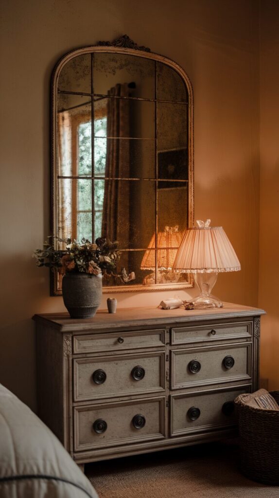 Vintage mirrors bring soul to bedrooms. They balance clean furniture with texture. They also tell a story without words.