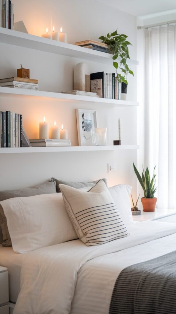 They’re especially great when you’re aiming for a clean, minimalist vibe. A set of slim white or black shelves instantly creates order while still giving you space to show off personality. Add a few framed prints, potted succulents, or flickering candles to keep things cozy but uncluttered.