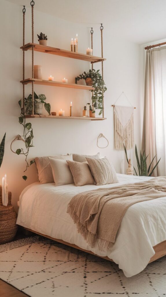 Here’s a unique twist for your room: hanging rope shelves. They’re lightweight, decorative, and bring a cozy boho feel into your bedroom.