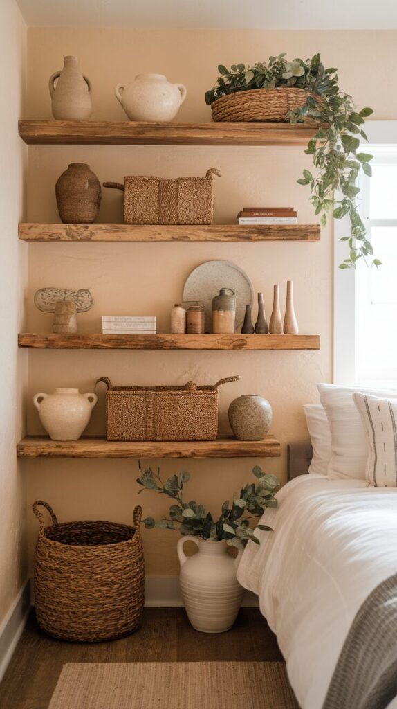 Style them with neutral décor, woven baskets, or earthy ceramics to enhance the natural feel. Rustic shelving works especially well if you’re aiming for a timeless, comfortable look.