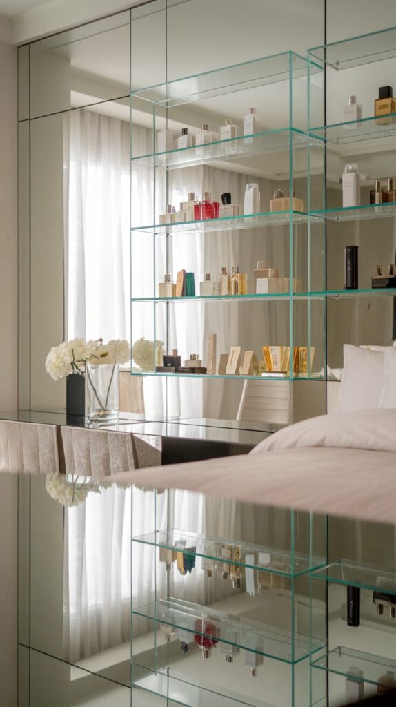 They’re fantastic for displaying delicate décor items, perfumes, or framed photos. The reflective surface also bounces light around, brightening the room.
