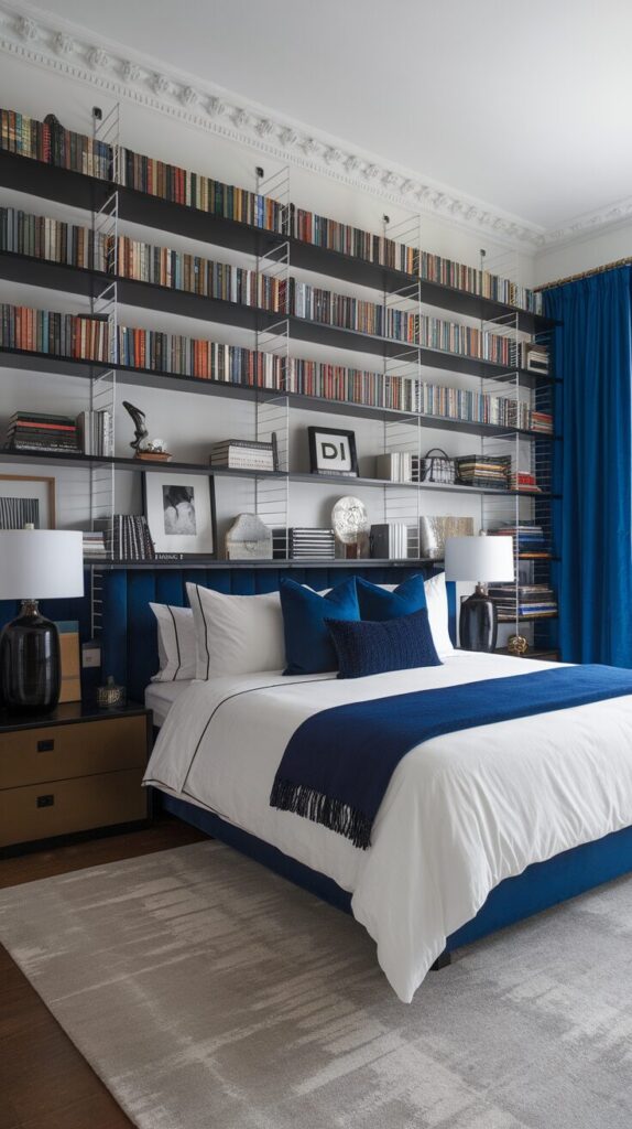This one’s perfect for anyone craving serious storage without sacrificing style. Built-in shelving blends right into your bedroom design, almost like it was always part of the plan. Think of floor-to-ceiling bookshelves framing your bed or an entire wall transformed into a statement storage solution.