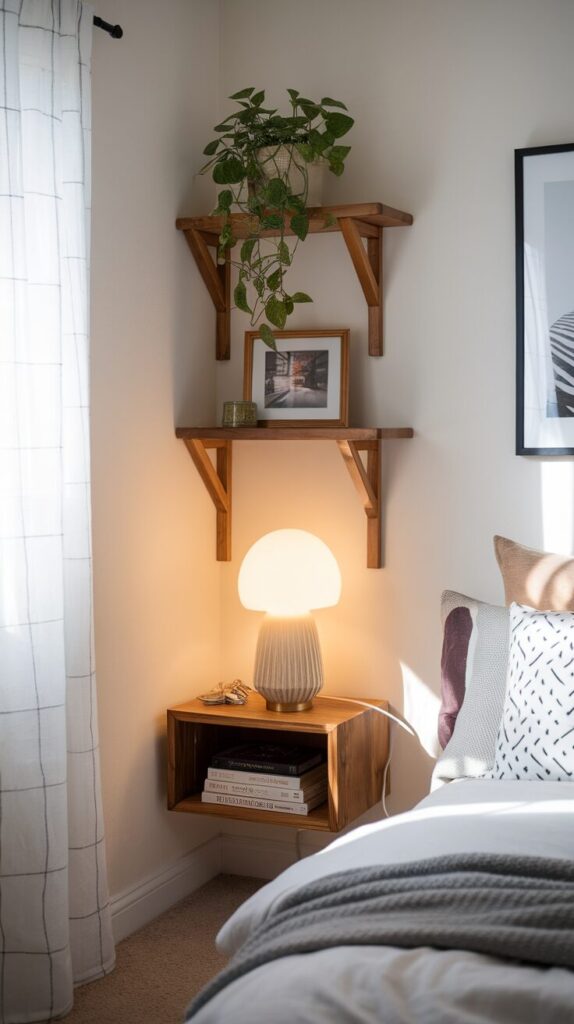 These shelves are small but mighty, creating just enough room for a lamp, a trailing plant, or a stack of your favorite bedtime reads. Suddenly, what used to be wasted space becomes a cozy design moment.