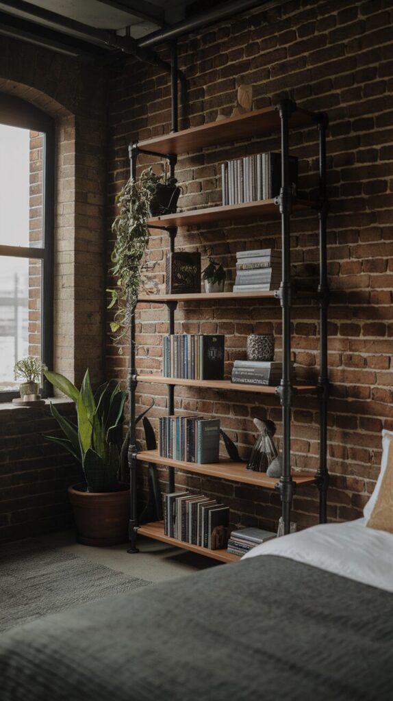 It’s also a DIY lover’s dream. With a few pipes, brackets, and some sturdy boards, you can build custom shelves that fit your exact space. Pair them with exposed bulbs or Edison lamps, and you’ve got yourself a loft-inspired bedroom right at home.