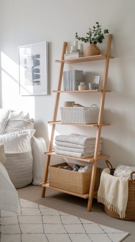 You can fill the rungs with storage baskets, folded blankets, or decorative knickknacks. Or, keep it airy by leaving some levels bare for that “effortlessly chic” look. Either way, the vibe is approachable and fun.