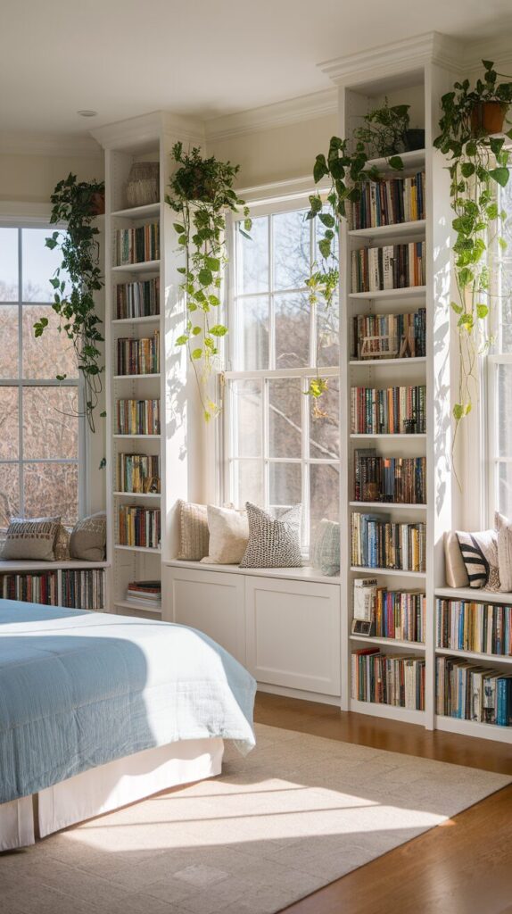 You can line the sides of your window with slim shelves for books and plants, or even add a shelf across the top for décor accents. The effect is cozy, stylish, and incredibly functional.