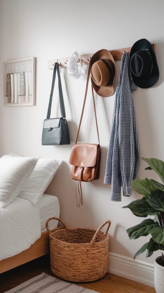 Wall hooks keep frequently used items off chairs and floors. I use them for bags, hats, and hoodies I grab daily.