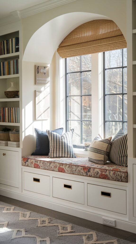 Window seats with storage feel cozy and smart at the same time. I love how they turn unused window space into function.