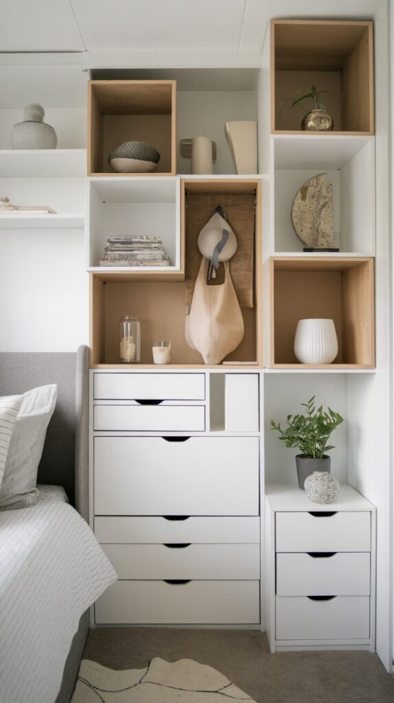 One major mistake involves overloading open shelves with too many items. Open storage demands discipline, and cluttered shelves instantly make a bedroom feel chaotic.