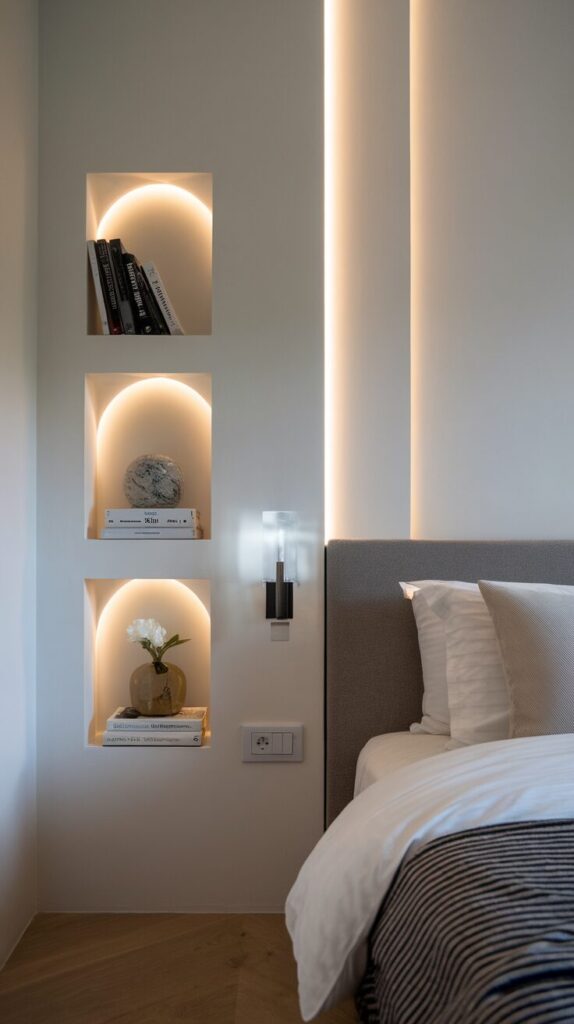 Wall niches create recessed storage without sticking out. I admire how clean and custom they look.