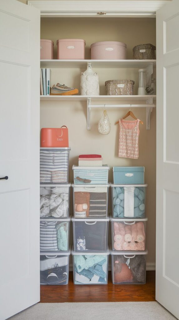 This works great if your closet lacks shelves. Temporary storage can still feel smart and intentional.