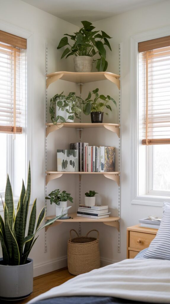 Corner shelves turn awkward angles into storage heroes. I love how they use space furniture often ignores.