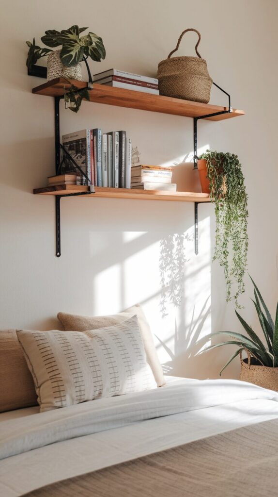 Floating shelves bring storage off the floor, which instantly makes a bedroom feel bigger. I use them for books, décor, and small baskets that hide clutter.