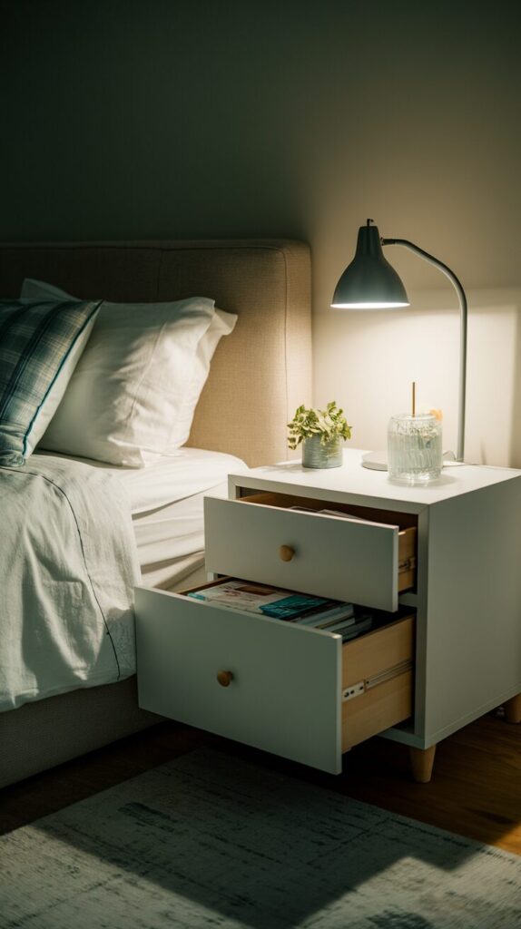 Nightstands with drawers beat open tables every single time. I need a place to hide chargers, notebooks, and random items I pretend I’ll organize later.