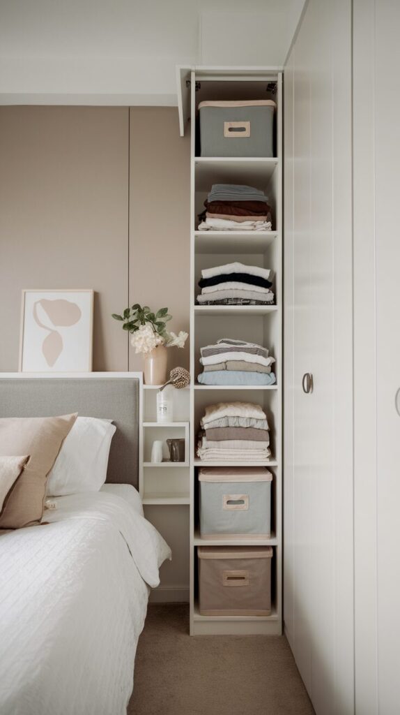 Tall vertical cabinets use height instead of width, which saves serious floor space. I recommend these when bedrooms feel cramped but cluttered.