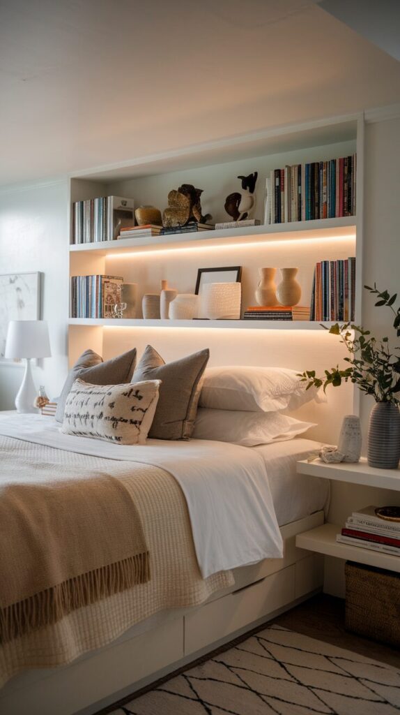 This setup works best when you keep items minimal and intentional. Practical headboards earn bonus points for creativity.
