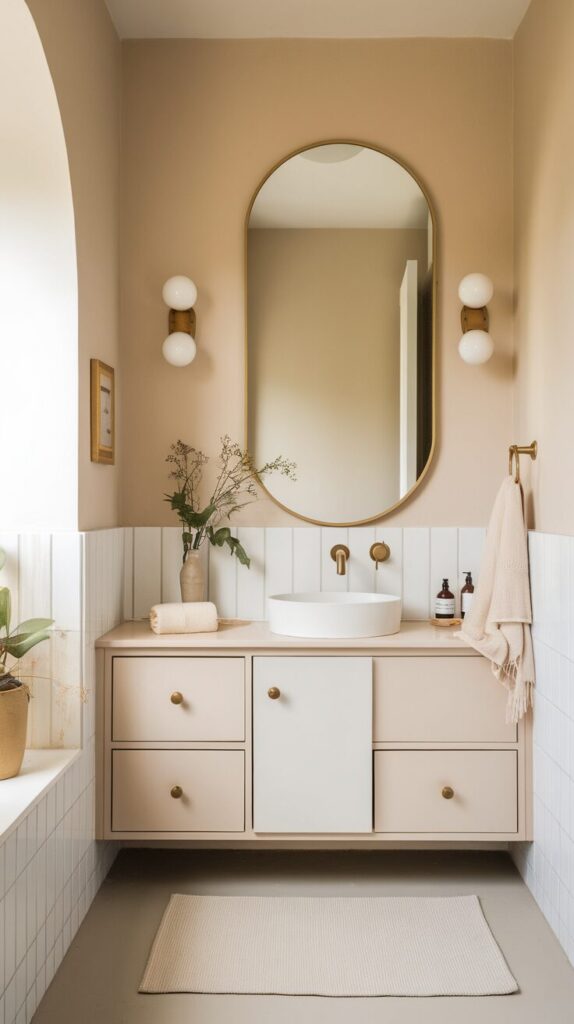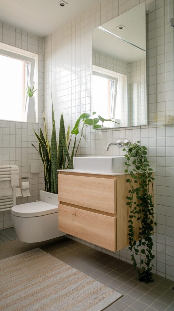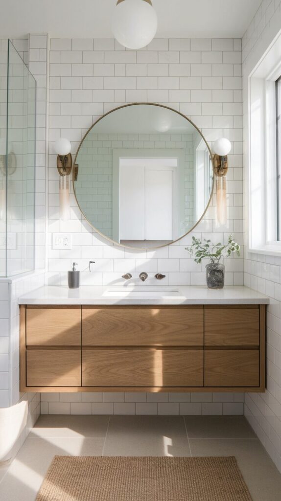 I love pairing a wooden vanity with crisp white walls because it keeps the space grounded. The contrast feels intentional and organic.